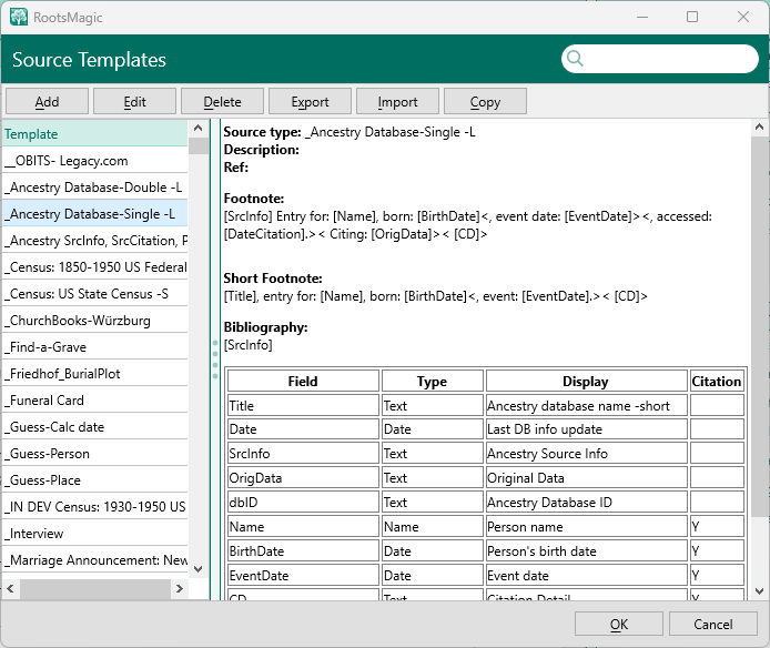 | Citation | Either blank or "Y". Blank means the field is associated with the Source (master source), Y means the field is associated with the citation. | <Template><Field><Detail> (value is either "false" or "true") |