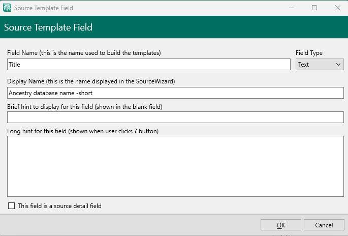 | Checkbox: | Checked means this field is a source detail field (citation) | <Template><Field><Detail> |