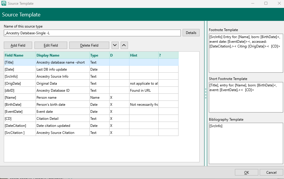 Configuration items that go into defining a source template are visible in three different windows. In some cases the same items are displayed with different names. Part of the problem is that nomenclature for sources and citations seems to have changed over the years but these dialogs have not been updated.