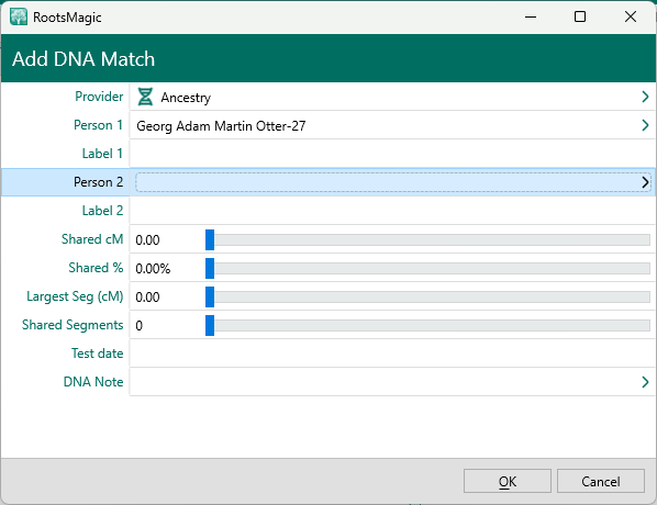 Enter the data for the fields using the match data from the DNA service's website, but for the "Person 2" field, select the "initial pseudo-person" (see below). I might do this for 50 entires at a time using an automated method. - At a later time, go through the entered matches and for each, examine the data available- matchee's name, closeness of match, matchee's online tree, shared matches list etc.